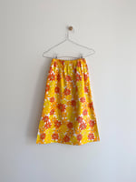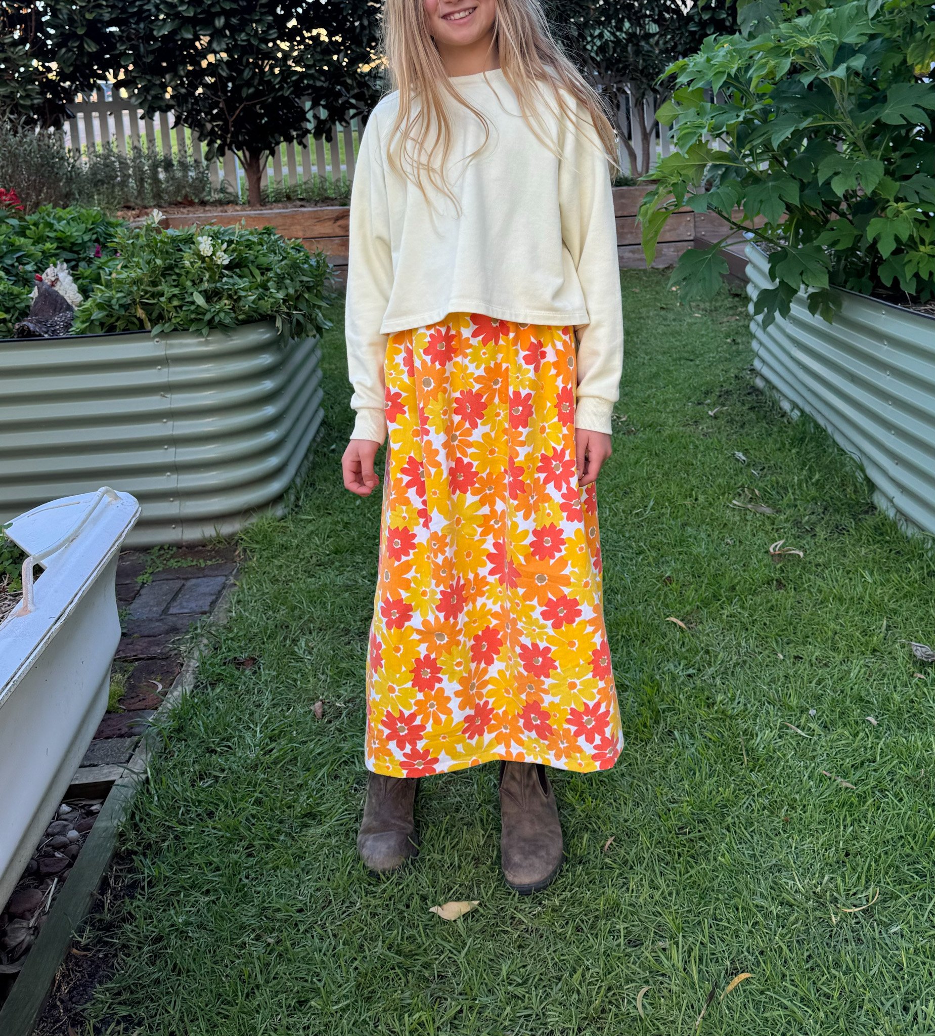 FRAY - A maxi length skirt with tomato, tangerine & yellow flowers on a white background, made from 100% cotton vintage fabric from the 1970's. Has an elasticized waist, side pockets and side splits.