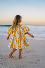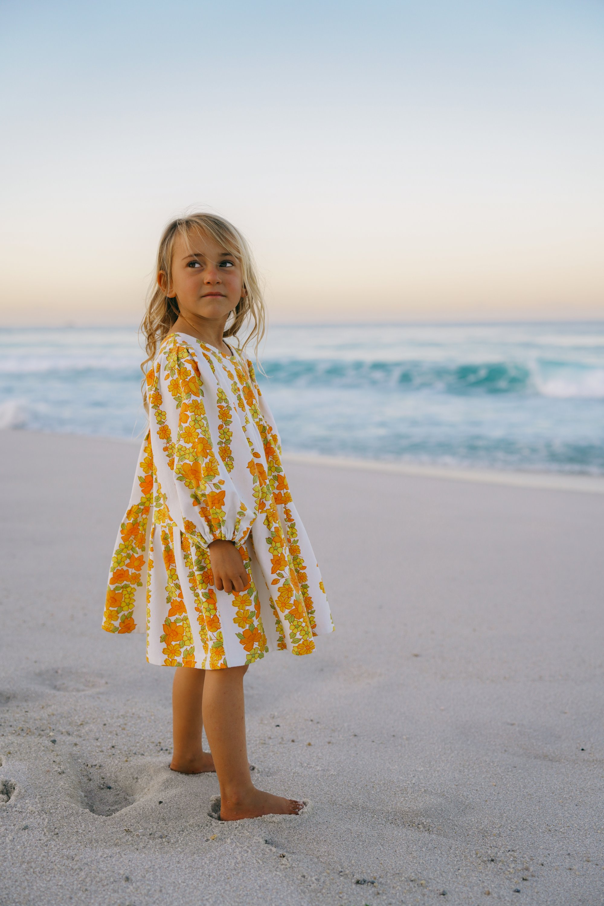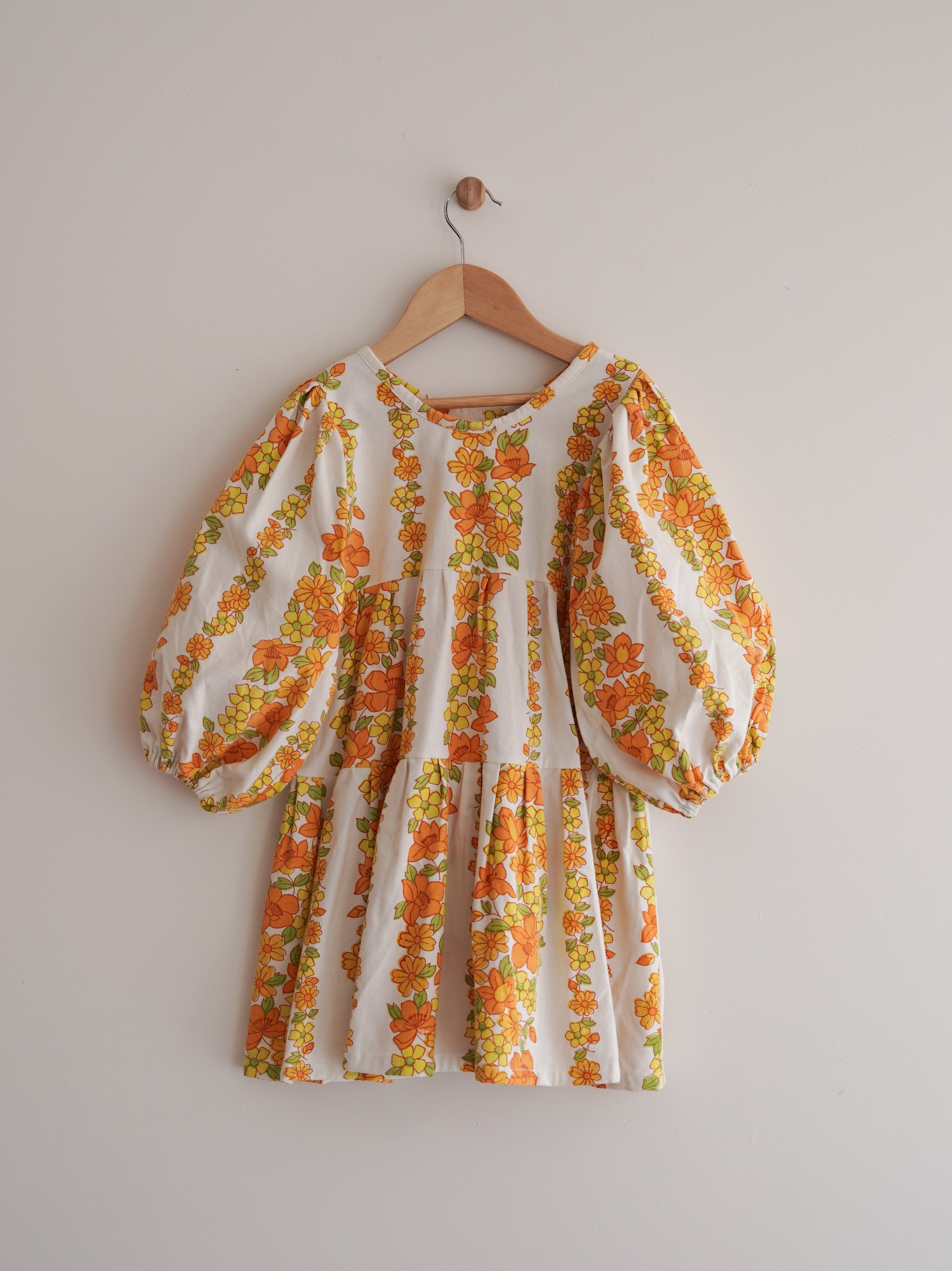 FRAY - A one-off shorter length dress with vertical lines of orange and yellow flowers and lime green leaves on a white background, made from a mid-weight 100% cotton vintage fabric from the 1970’s. (Would make a cute Autumn dress.) Sleeves are 7/8 in length and can be pushed up to create billow or worn long.