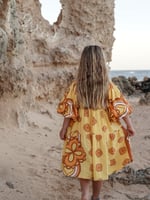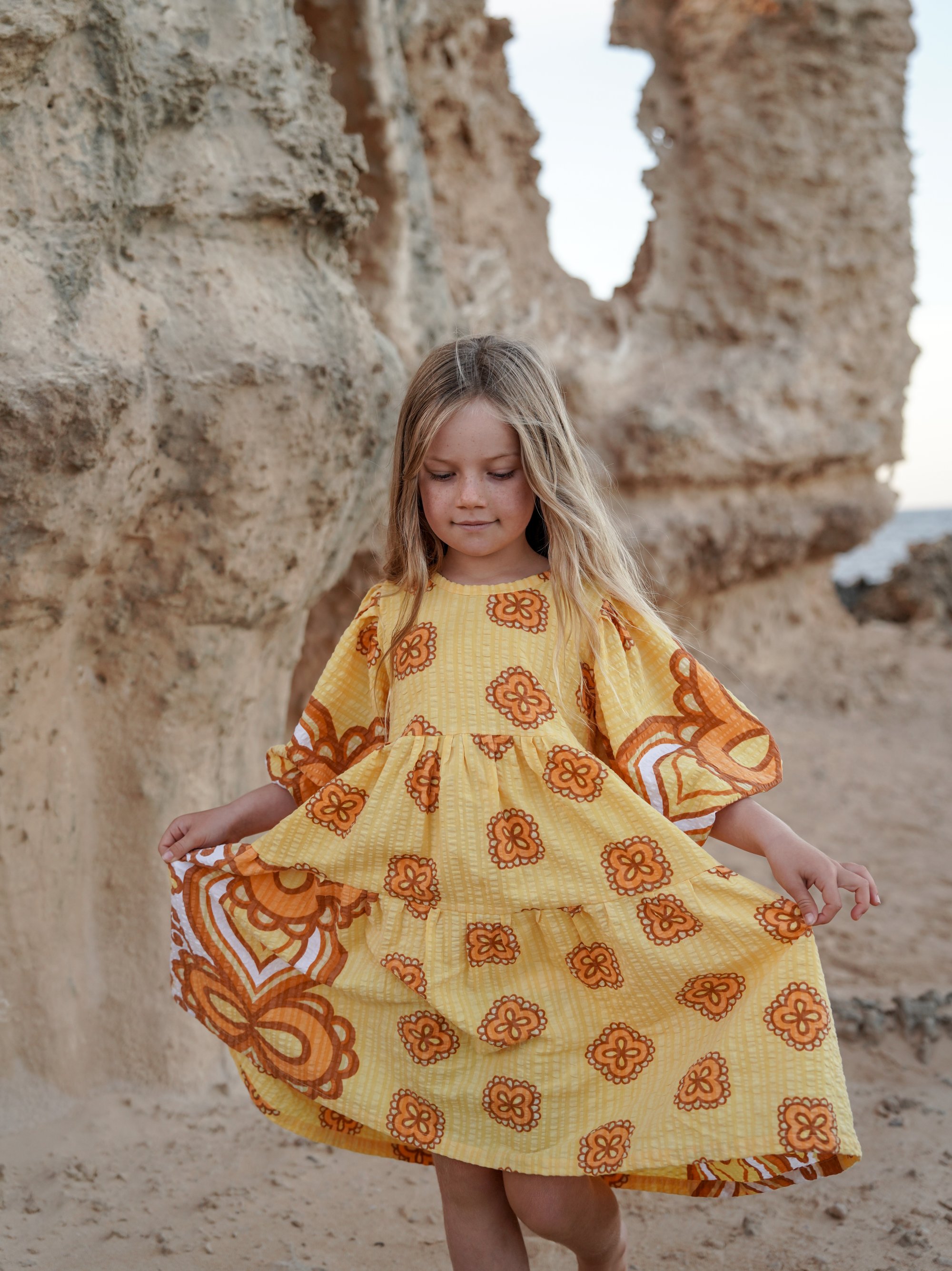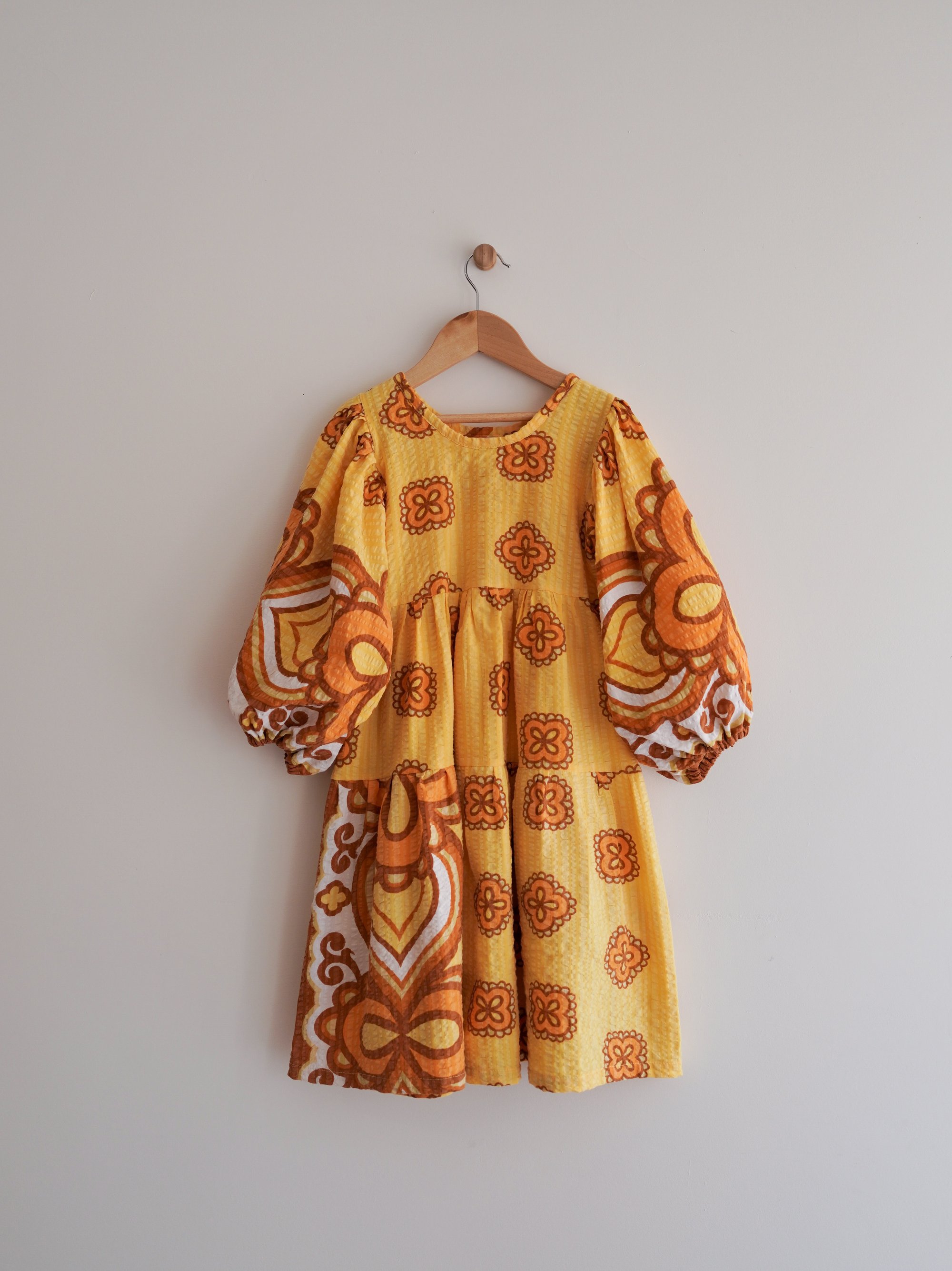 FRAY - A one-off midi-length dress with an orange, tan and white floral print on a lemon background, made from 100% cotton seersucker vintage fabric from the 1970’s. Sleeves are 7/8 in length and can be pushed up to create billow or worn long.