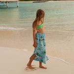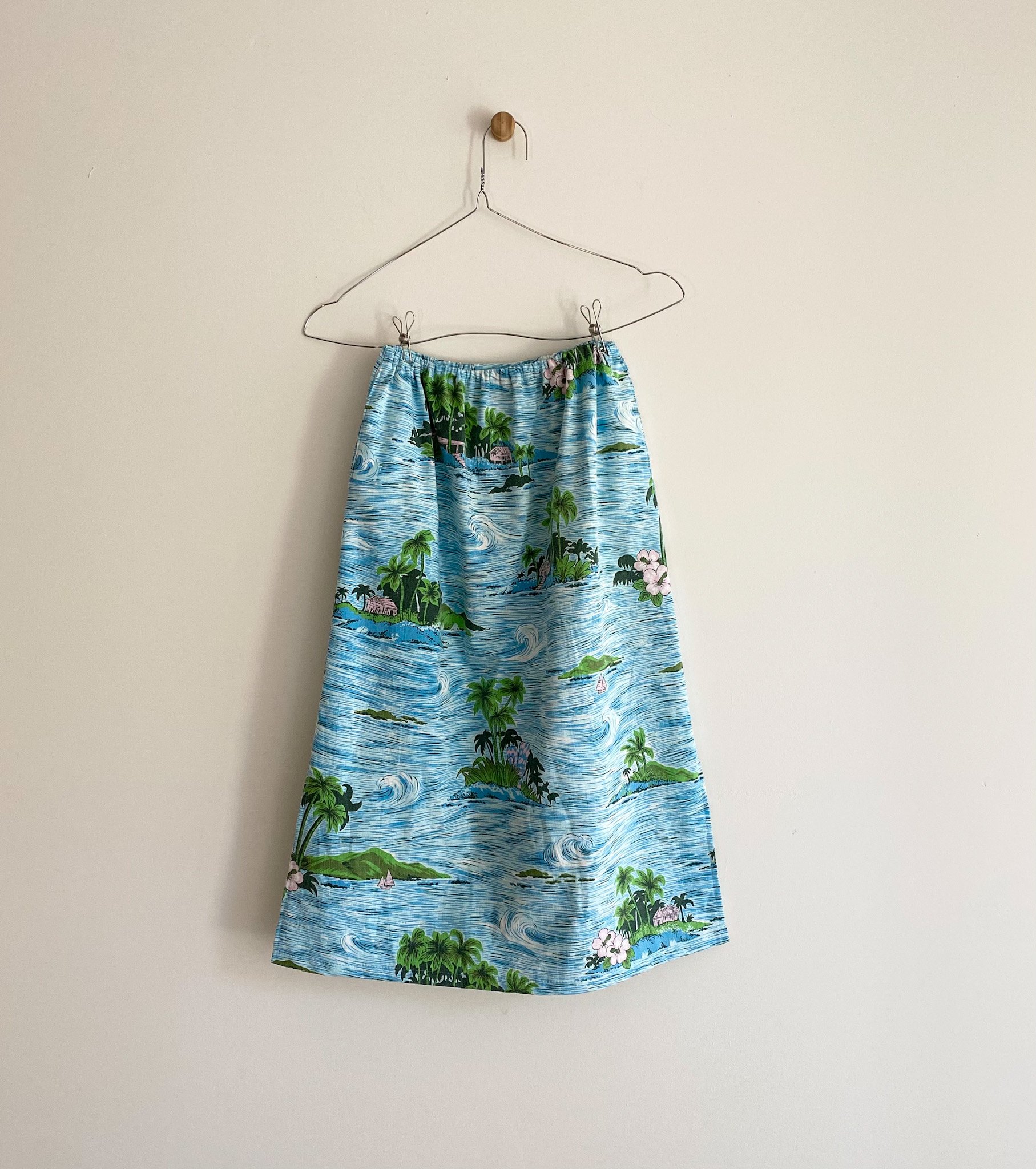 FRAY- A maxi length skirt with ocean & palm tree print in pink, green, blue and white colours, made from 100% cotton vintage fabric from the 1980's. Has an elasticized waist, side splits and side pockets.