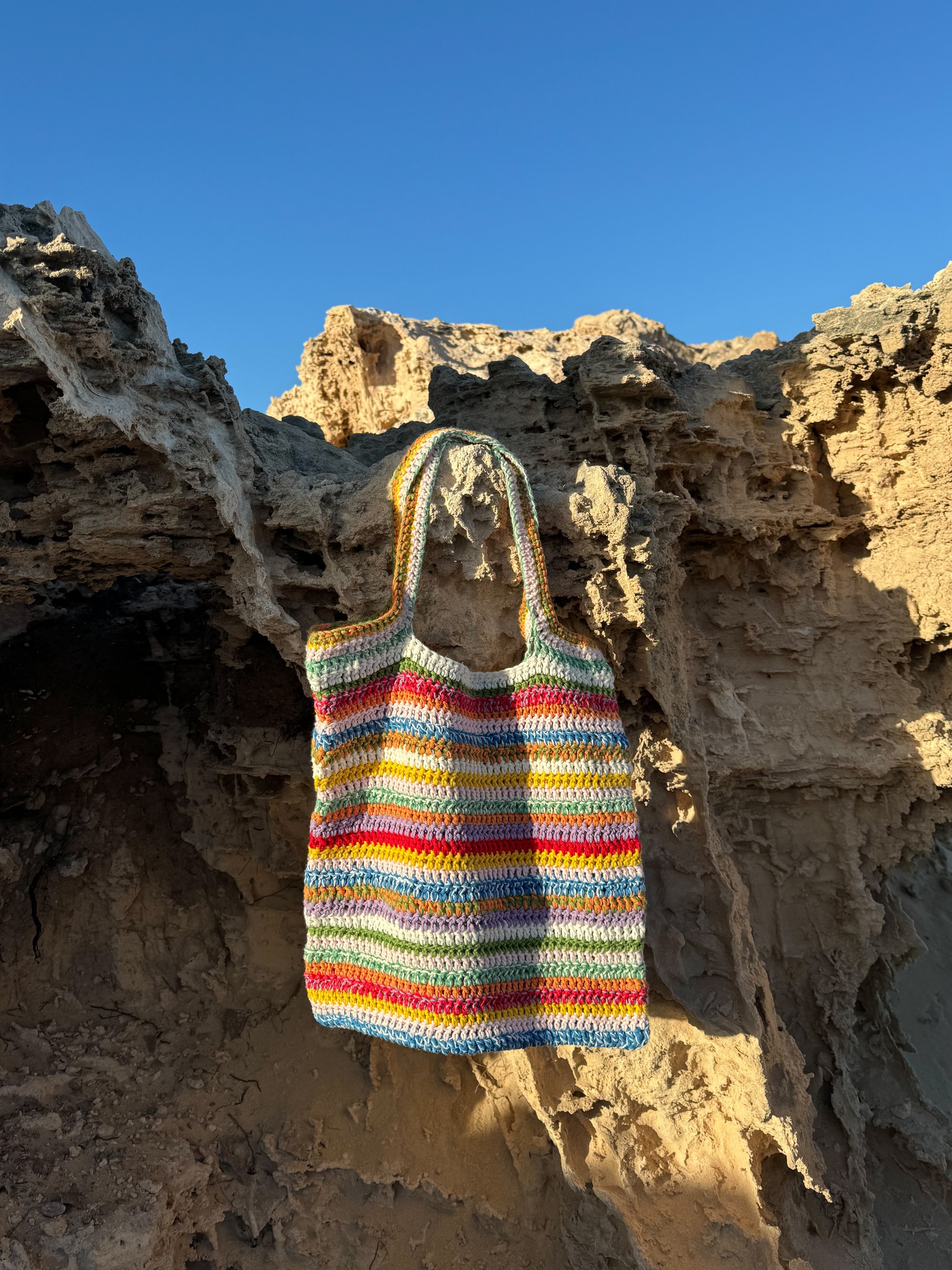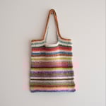 ADULT'S chunky crochet market bag in multicolour stripes handmade with 100% cotton & cotton blend yarns.