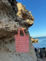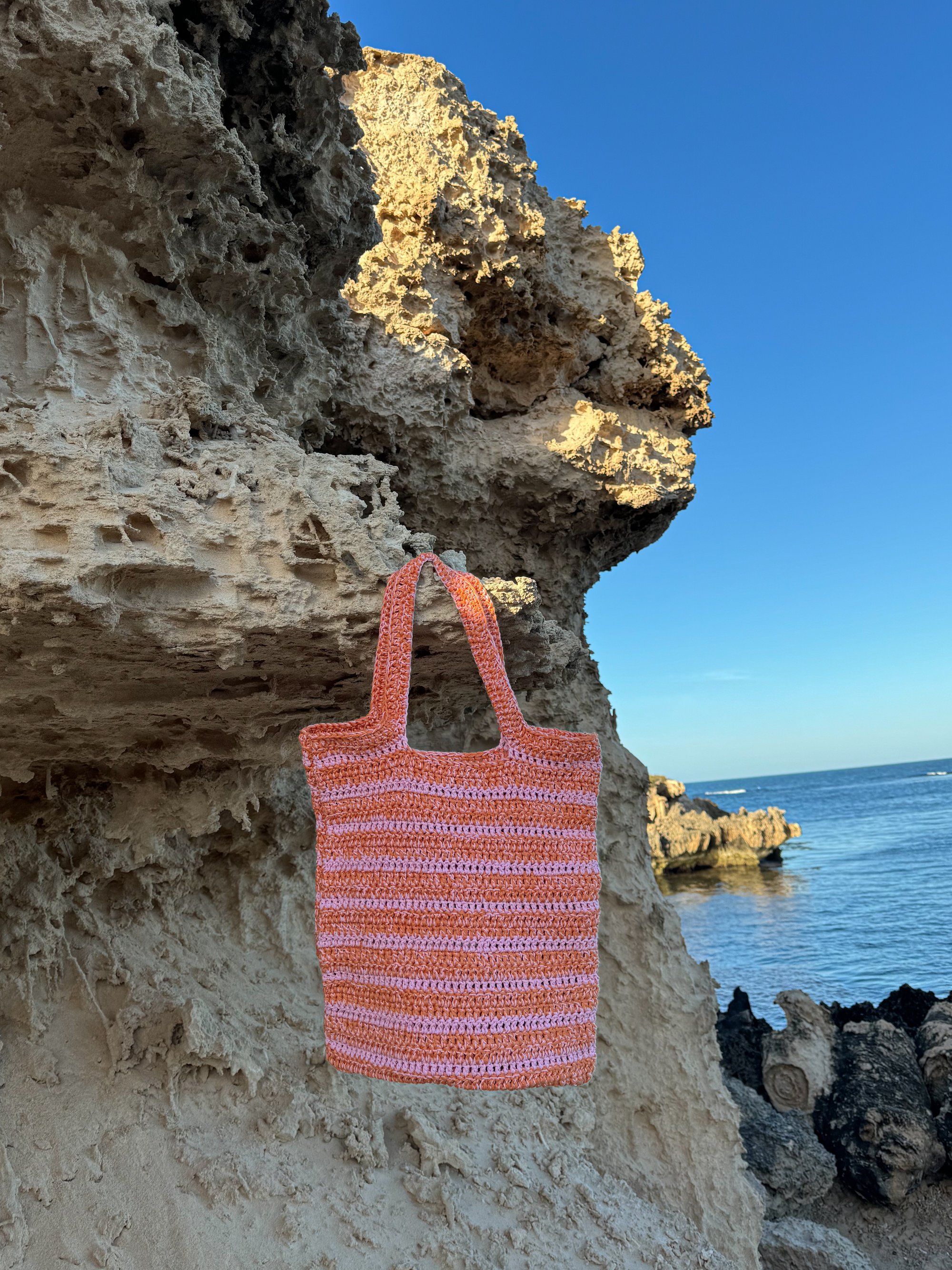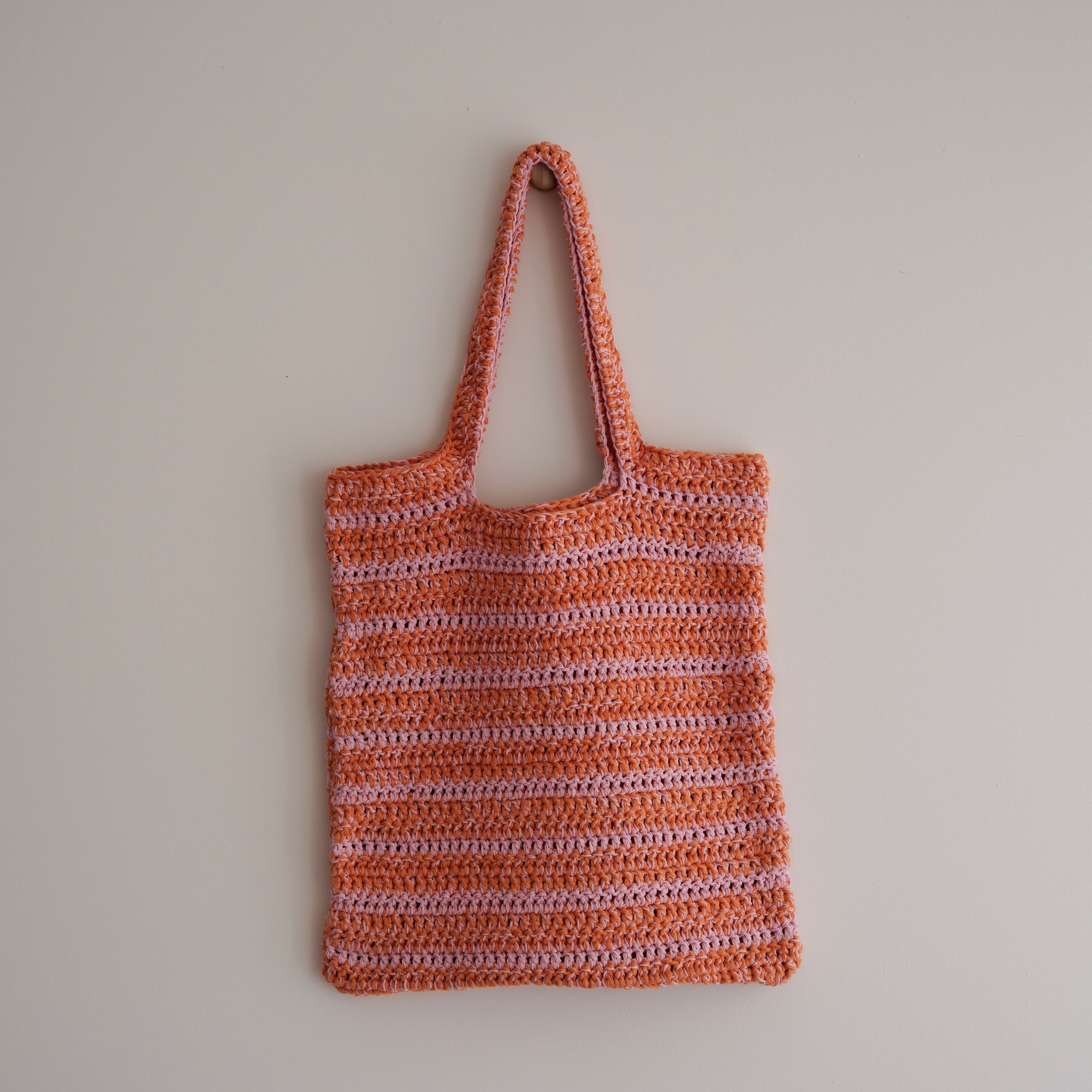 ADULT'S chunky crochet market bag in tangerine and pink stripes, handmade with 100% cotton & cotton blend yarns.