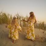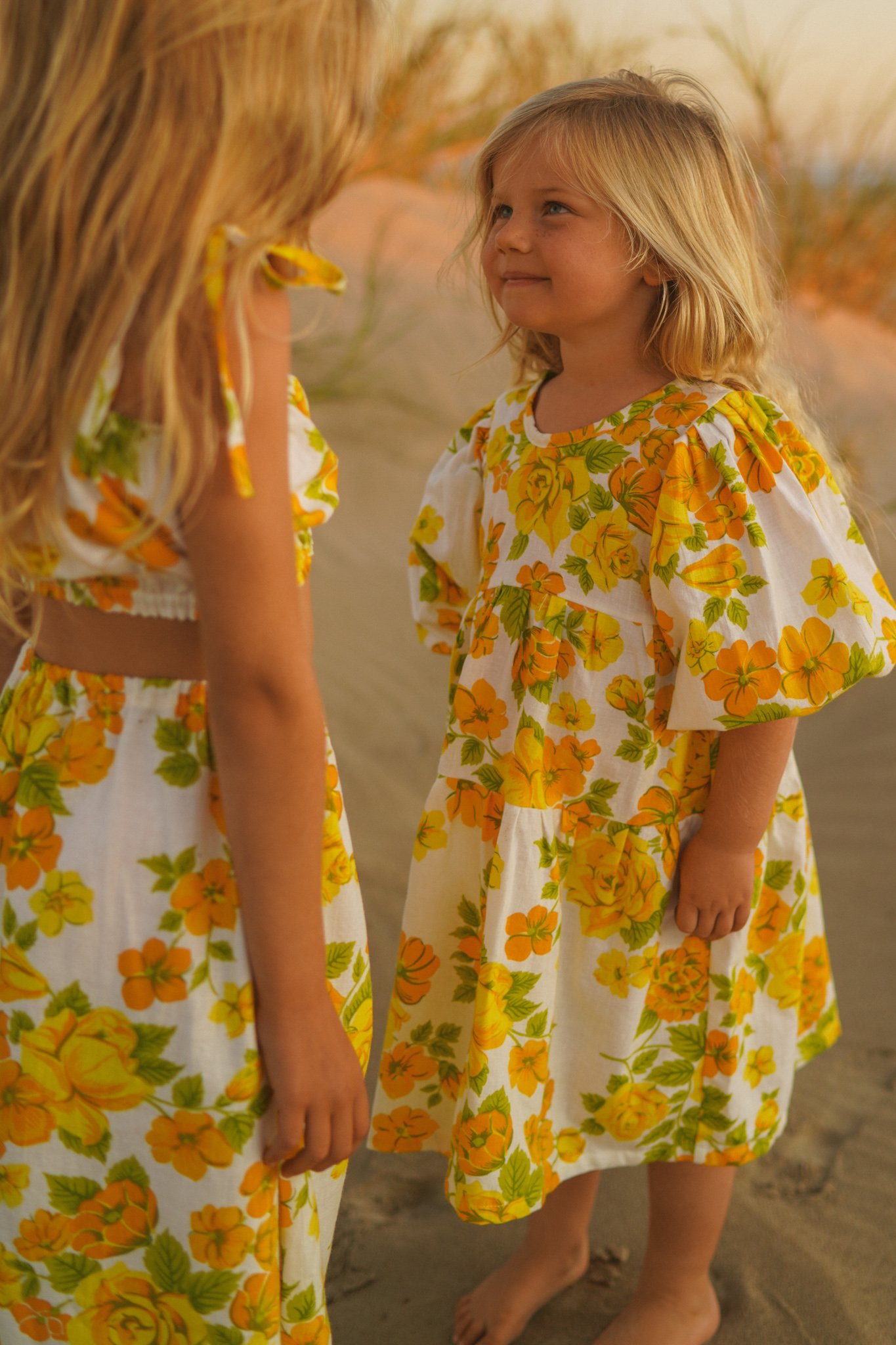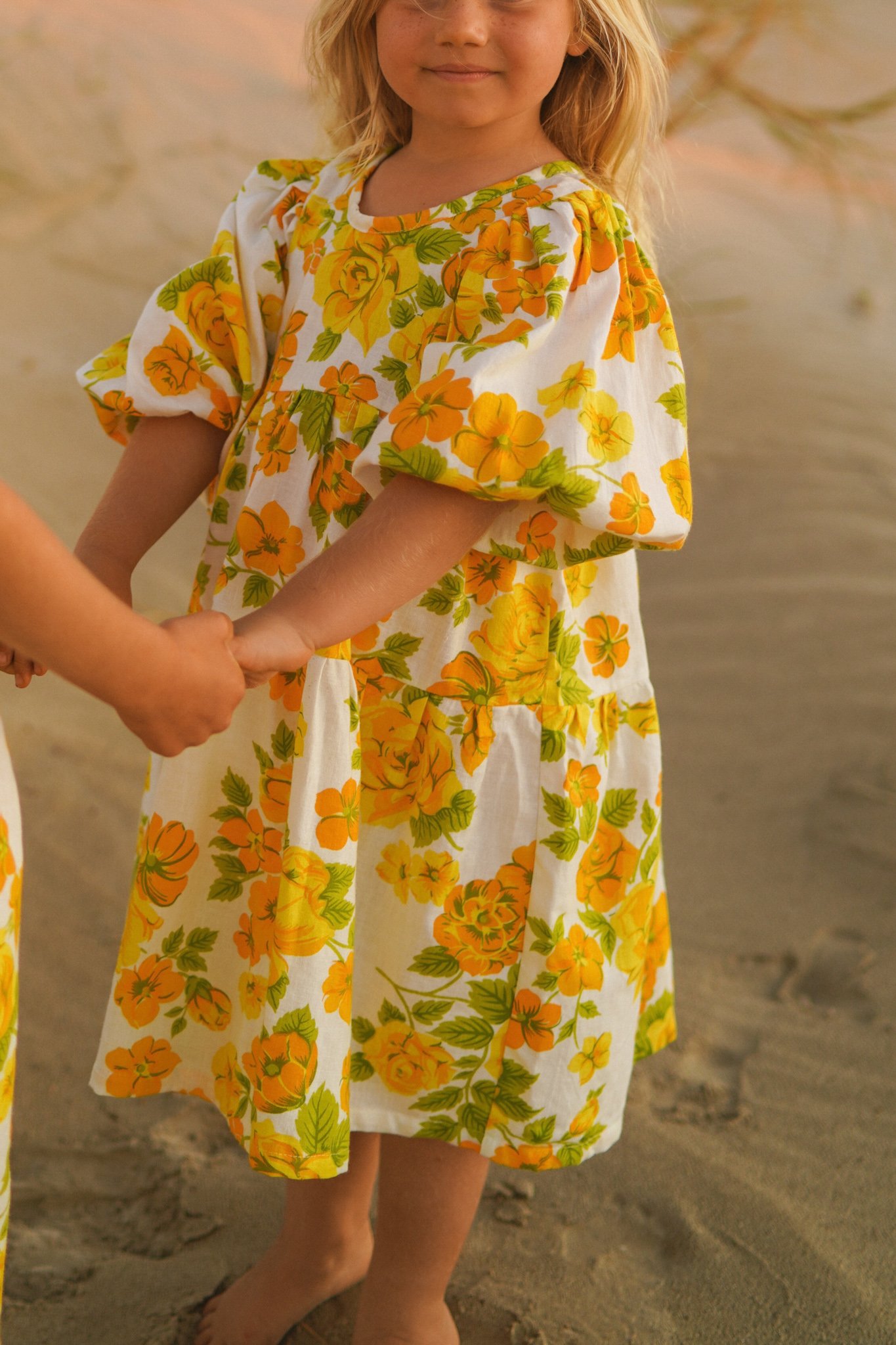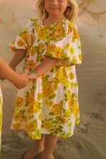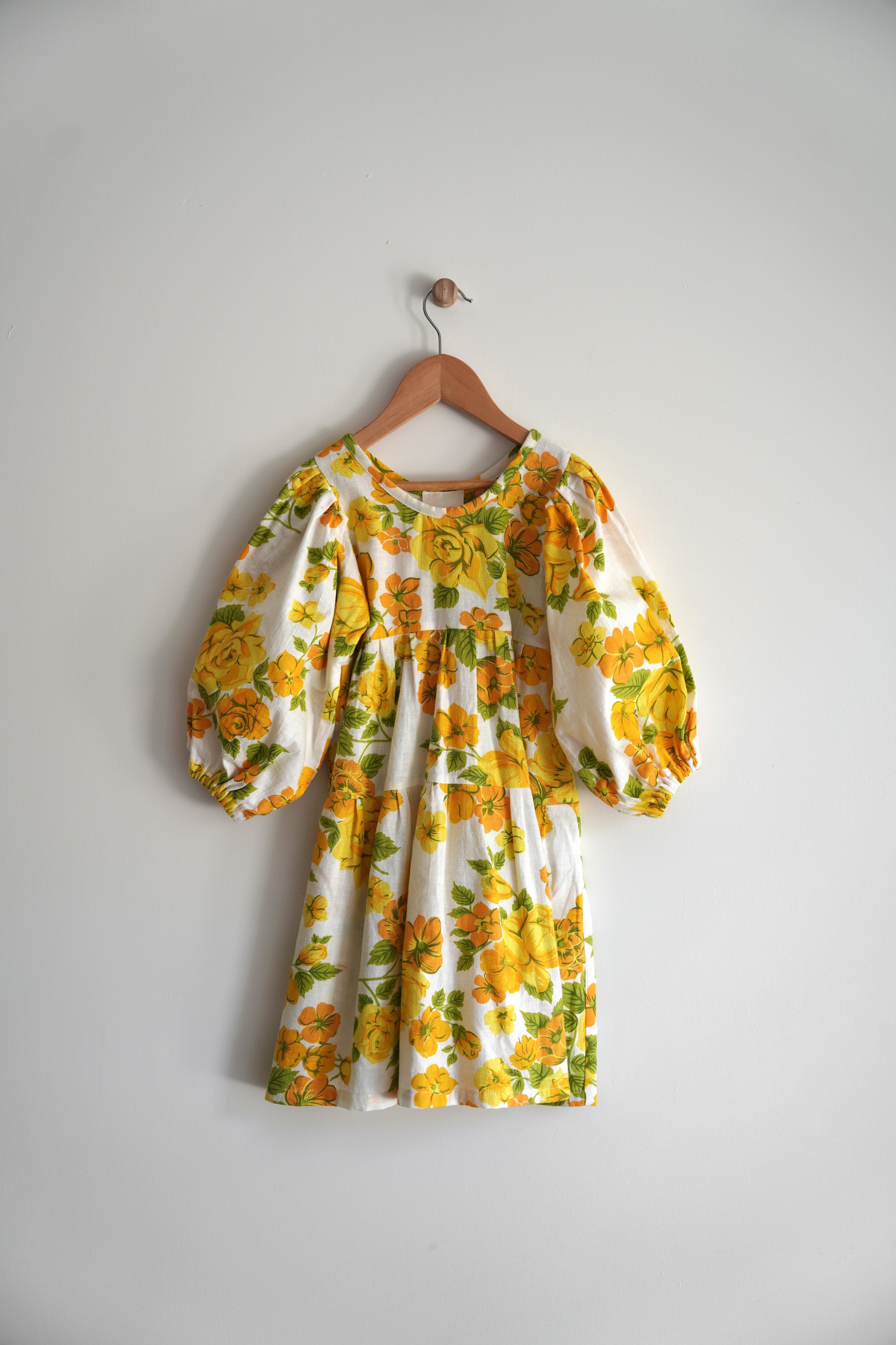 FABLE - A sunshine dress with yellow and tangerine floral print on white background, made from 100% cotton dead stock vintage fabric from the 1970’s. Sleeves are 7/8 in length and can be pushed up to create a billow or worn long.