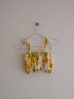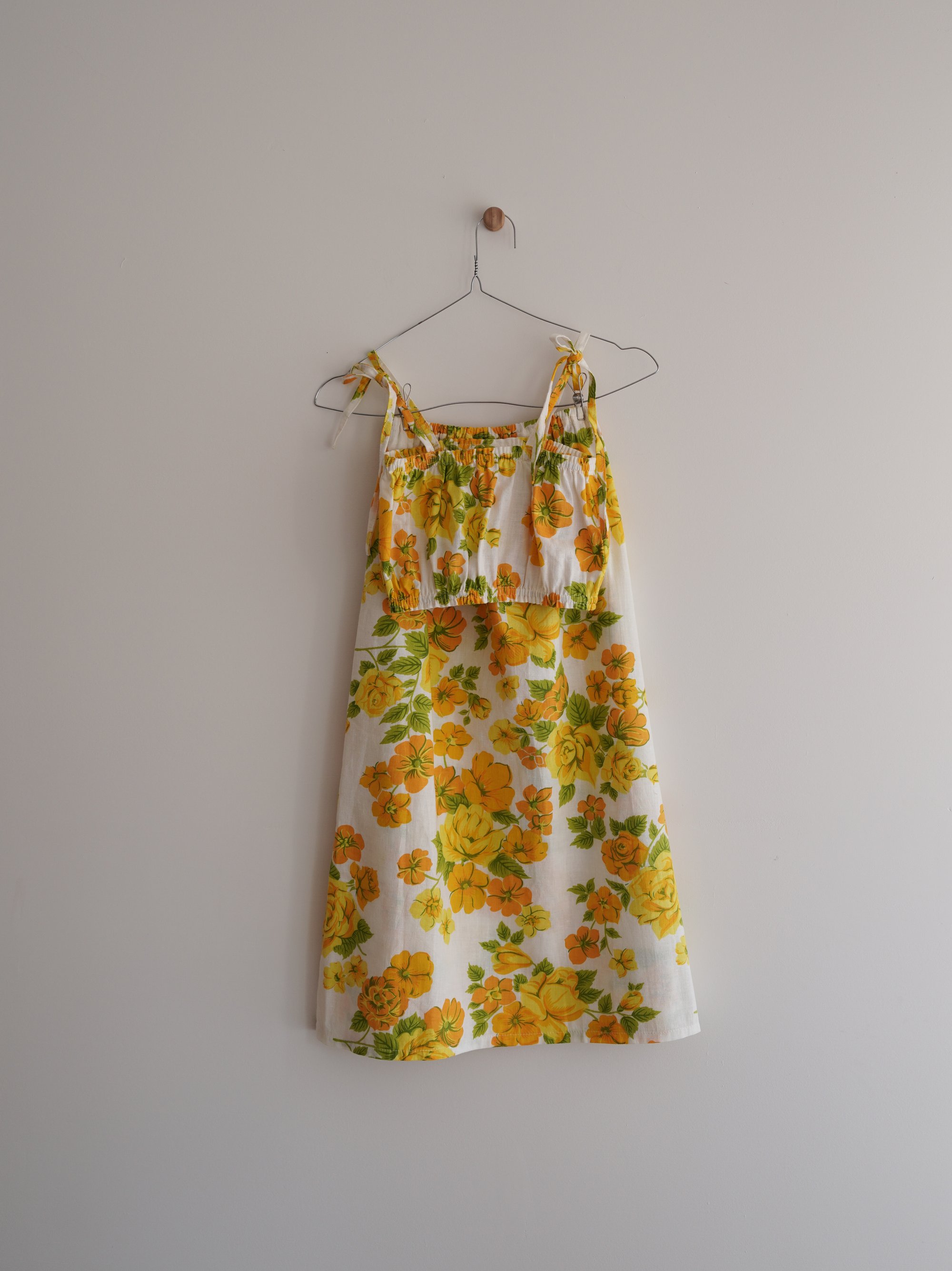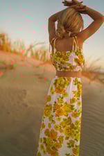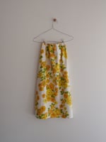FABLE - A one-off set with yellow and tangerine flowers and green leaves on a white background, made from 100% cotton dead stock vintage fabric from the 1970’s. Skirt is maxi length with side splits and elasticated waist and top is elasticised at both ends with ties.