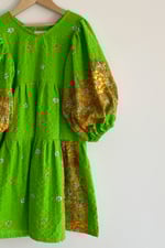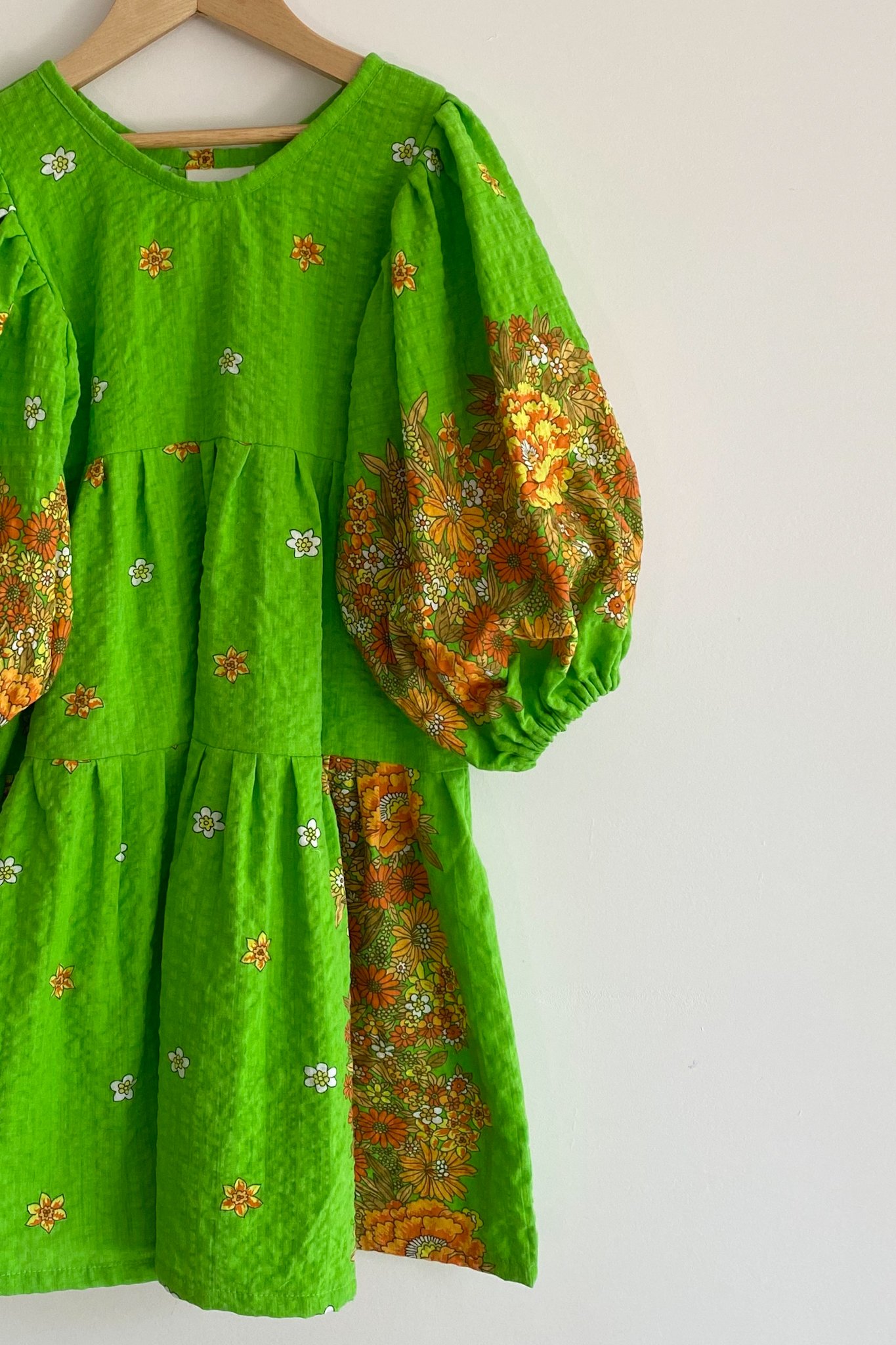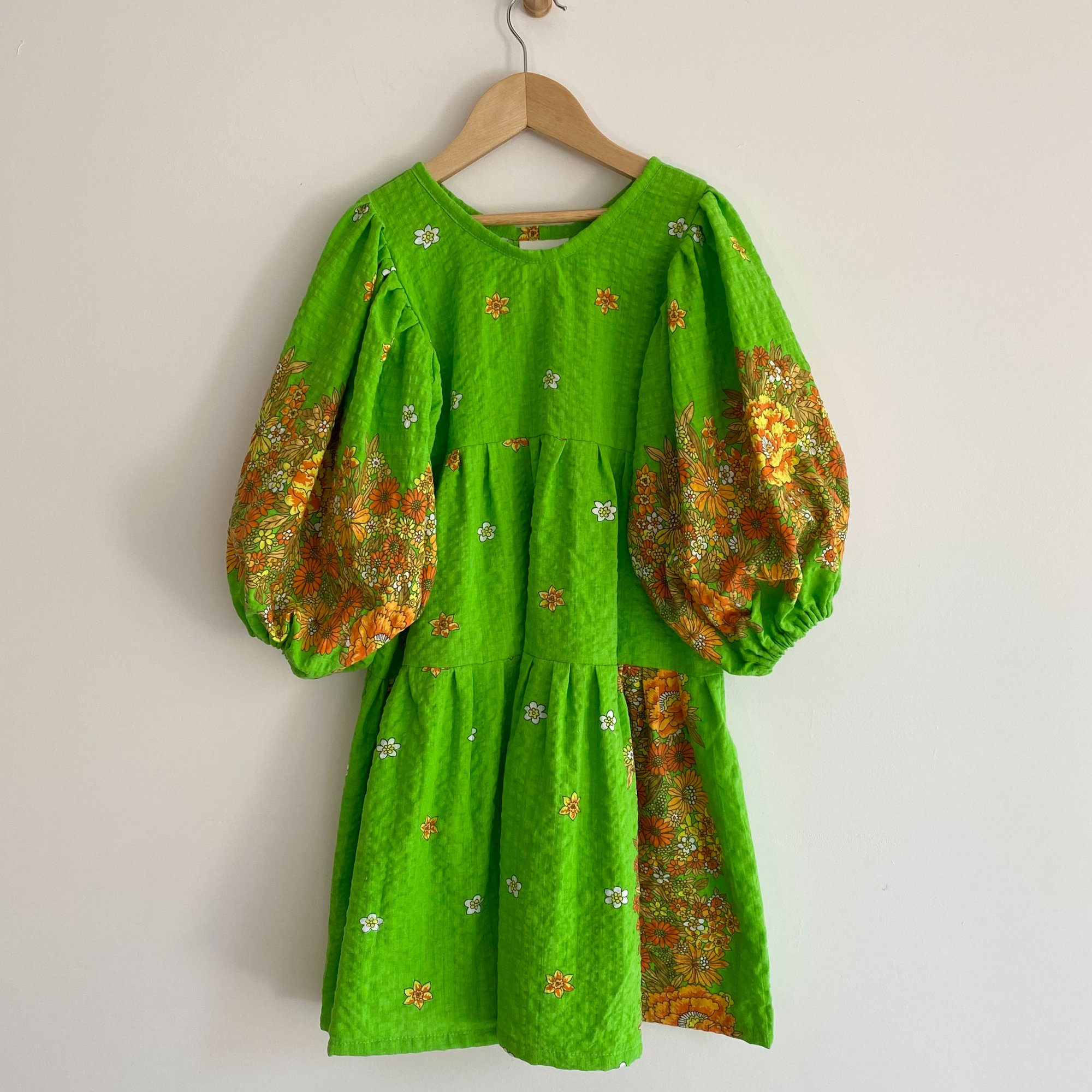 FRAY - A one-off midi length dress with lemon, orange, terracotta & white floral print on a bright green background, made from 100% cotton seersucker vintage fabric from the 1970's. Sleeves are 7/8 in length and can be pushed up to create billow or worn long.