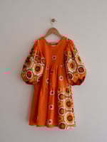 FRAY - A one-off midi- length dress with large yellow, brick and white flowers on a bright tangerine background, made from 100% cotton seersucker vintage fabric from the 1970’s. Sleeves are 7/8 in length and can be pushed up to create billow or worn long.