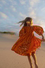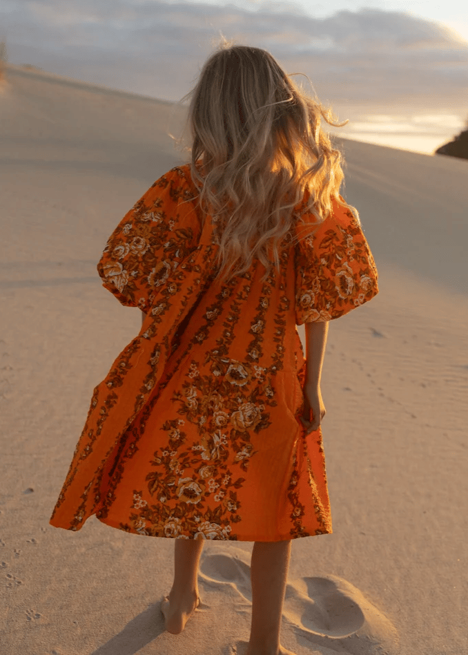 FABLE - A one-off longer style dress with brown, mustard and white floral print on tangerine background, made with 100% cotton seersucker dead stock vintage fabric from the 1970’s. Sleeves are 7/8 in length and can be pushed up to create billow or worn long.