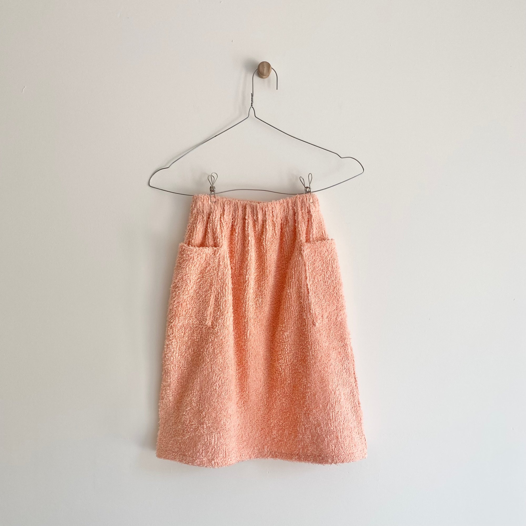 FABLE- A 7/8 length skirt in peach with elasticated waist, square pockets on each side and side splits, made from 100% cotton chenille dead stock vintage fabric from the 1970’s. The fabric is prone to pill unfortunately, but is super soft, textured and lush.